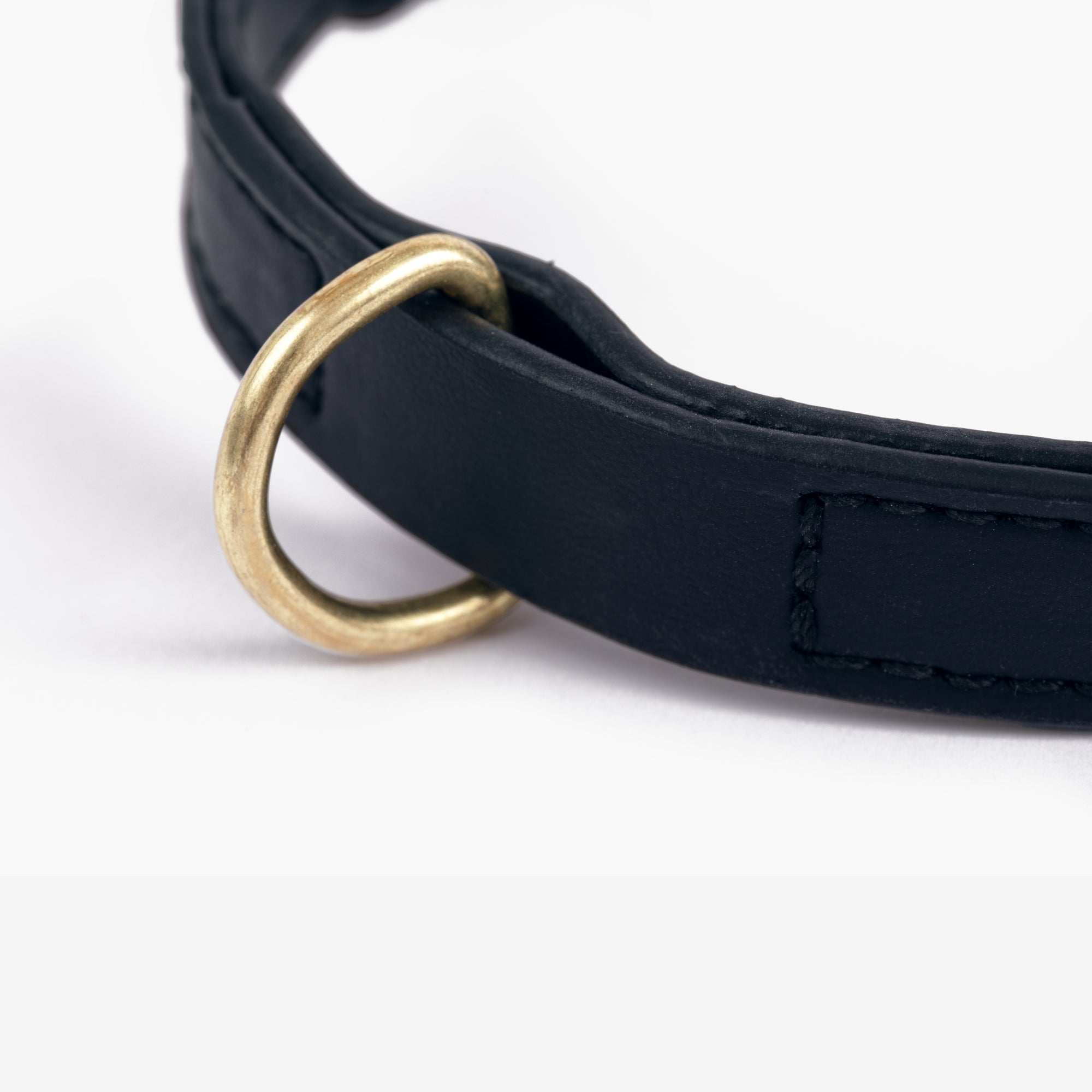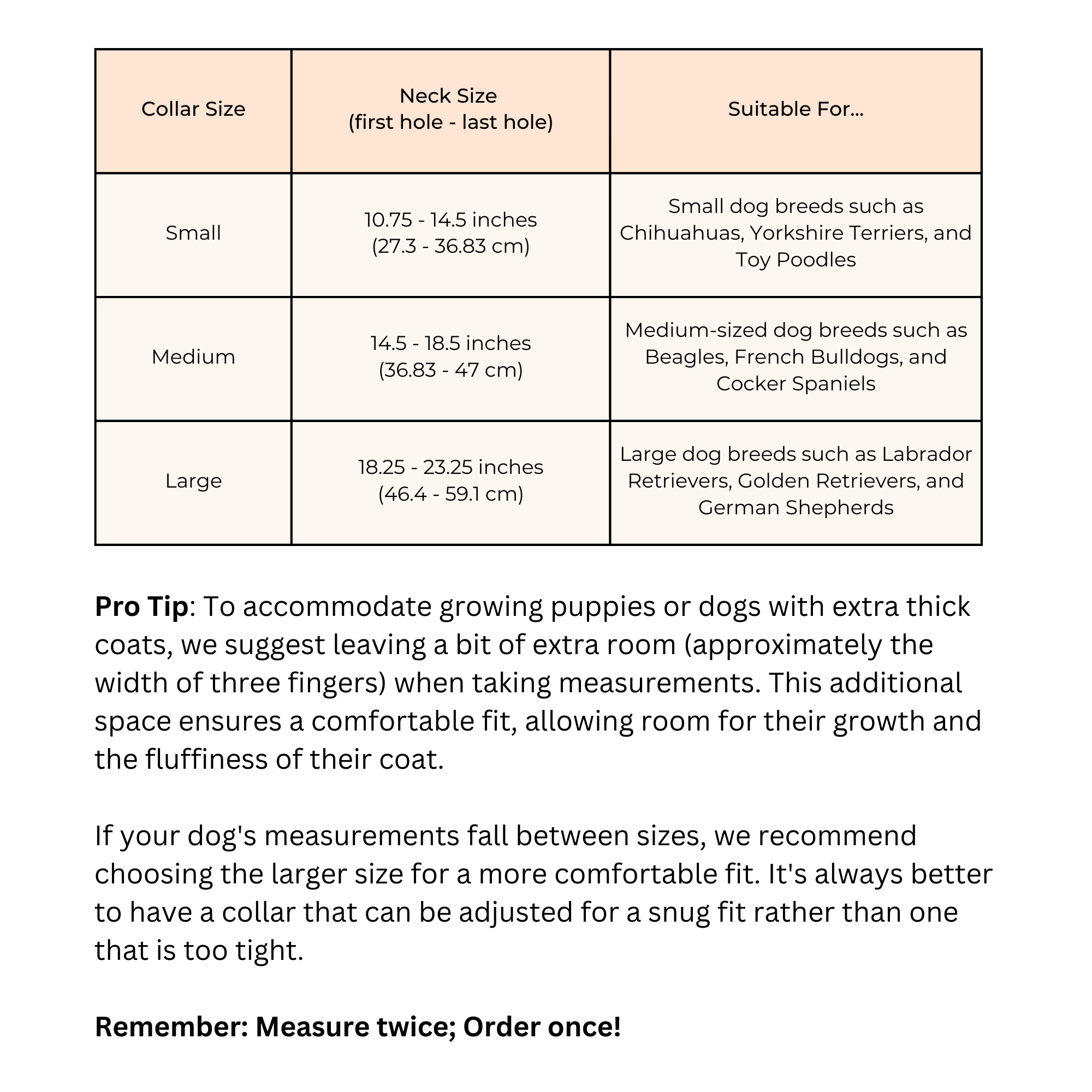 Product Description Say hello to your pup’s fav new fit: the Two Tails Pet Company Cactus Leather Dog Collar in black. Versatile, vogue, and modern this collar is a total fashion statement. Crafted with care and sustainability in mind, this cactus leather collar is stylish, eco-friendly, easy to clean, and supremely functional. Featuring elegant gold hardware, our collar adds a touch of sophistication to your dog’s ensemble. The backside D-ring ensures easy leash application, which makes getting an excited dog ready for a walk seamless and simple. Plus, the dedicated D-ring on the front of the collar is designed so your dog’s ID tag lies flat against their fur, showing off their adorable Two Tails Pet Company ID Tag which keeps them safe and easily identifiable. And of course looks so dang cute. Choose one of our 3 timeless colors and sizes to find one that is not too big, not to small, but just right for your pup. Benefits & Features Sustainably Sourced Vegan Leather Easy-to-Clean Soft to the touch, strong to the pull Easy Leash Application: D-Ring on the back of the collar for hassle-free leash attachment Lie-Flat ID Ring: D-Ring on the front neck of the collar for a properly flaunted ID tag Size Guide There’s nothing worse than being excited about a purchase only to get it in the mail and find it doesn’t fit. We’re here to make sure that doesn’t happen! To best assess your dog’s collar size, gently wrap a soft tape measure around the widest area of their neck (typically near their shoulders). If you don’t have a soft tape measure, we recommend using a piece of string and measuring it against a measuring tape afterwards. To ensure a comfortable fit, insert two fingers perpendicularly between the tape measure and your dog’s neck. This will help you find the perfect fit that allows for both comfort and mobility. Collar Size Neck Size (first hole to last hole) Suitable For… Small 10.75 – 14.5″ inches (27.3 – 36.83 cm) Suitable for small dog breeds such as Chihuahuas, Yorkshire Terriers, and Toy Poodles Medium 14.5″ – 18.5″ inches (36.83 – 47 cm) Suitable for medium-sized dog breeds such as Beagles, French Bulldogs, and Cocker Spaniels Large 18.25″ – 23.25″ inches (46.4 – 59.1 cm) Suitable for large dog breeds such as Labrador Retrievers, Golden Retrievers, and German Shepherds Pro Tip: To accommodate growing puppies or dogs with extra thick coats, we suggest leaving a bit of extra room (approximately the width of three fingers) when taking measurements. This additional space ensures a comfortable fit, allowing room for their growth and the fluffiness of their coat. If your dog’s measurements fall between sizes, we recommend choosing the larger size for a more comfortable fit. It’s always better to have a collar that can be adjusted for a snug fit rather than one that is too tight. Remember: Measure twice; Order once!