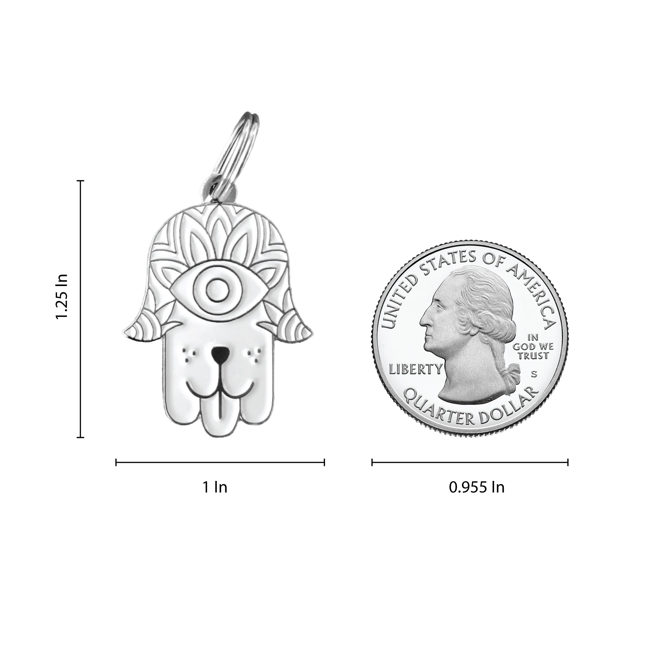 Keeps away bad spirits while bringing in happiness, good luck, and dog kisses with the dog faced ‘Hamsa’ Pet ID Tag in silver and white. The Hamsa is ancient Middle Eastern symbol for luck and protection that has been adopted by cultures all over the world. People put Hamsas everywhere including near doors and hanging from rear view mirrors. We thought we should place it around the neck of the one we love most. Because what would we do without our best fur-buddy? Protect you pooch with the ‘Hamsa’ Pet ID Tag in silver and white. Available in black and white with gold or silver plating so your pup’s style is always fresh. Free engraving! Add your dog’s name to one of our custom dog tags for dogs! Each pet ID tag can be personalized with up to four lines of text on the backside. Please include engraving details in the text box and/or order notes section. Our precision laser-engraving is guaranteed to last, so your pup’s way home will never rub off. And its all engraved and shipped in the USA. Make sure to include your engraving details in the ‘Type Pet ID Information Here’ text box. (pet’s name, owner’s name, phone number) Dimensions: 1 inch x 1.25 inch (25.8 mm x 31.75 mm) Material: Brass, Gold Plating, and Soft Enamel Please allow 4–5 business days of production time before shipping. Once shipped, U.S. orders usually arrive in 3–5 business days.