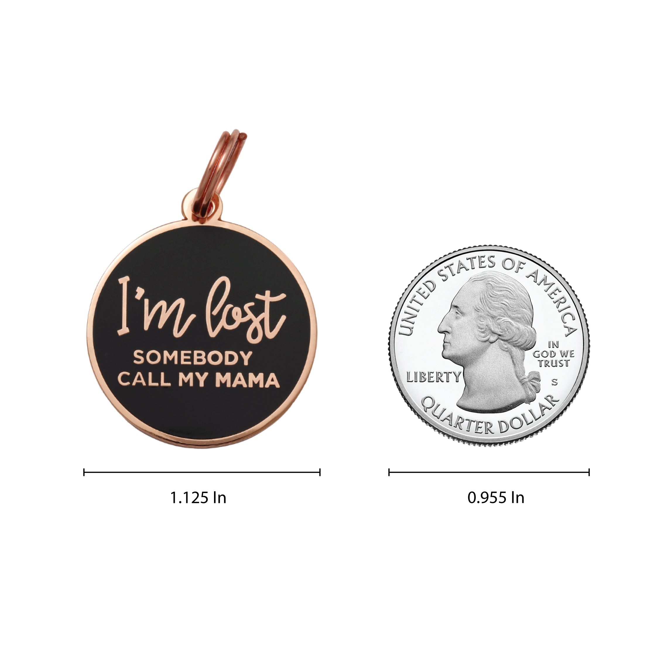 There’s no place like home, so don’t be too proud to ask for directions. The ‘I’m Lost, Somebody Call My Mama’ Pet ID Tag in rose gold and navy lets a good Samaritan know you need a little help. This pet ID Tag, like all Pet ID Tags, is like a north star, because it will always help you find your way home. Not only for the physically lost, this tag is great for the existentially lost too. Sometime you feel so far away and all you want is home and for your mama to fix you a plate and take care of you. You’re never too old for that. Maybe you should keep ‘I’m Lost, Somebody Call My Mama’ ID Tag on your keychain too. Just in case you need a little TLC too. Available in navy and white so your pup’s style is always fresh. Free engraving! Add your dog’s name to one of our custom dog tags for dogs! Each pet ID tag can be personalized with up to four lines of text on the backside. Please include engraving details in the text box and/or order notes section. Our precision laser-engraving is guaranteed to last, so your pup’s way home will never rub off. And its all engraved and shipped in the USA. Make sure to include your engraving details in the ‘Type Pet ID Information Here’ text box. (pet’s name, owner’s name, phone number) Dimensions: 1.125 Inch diameter (28.58mm) Please allow 4–5 business days of production time before shipping. Once shipped, U.S. orders usually arrive in 3–5 business days. Material: Brass, Rose Gold Plating, and Hard Enamel.