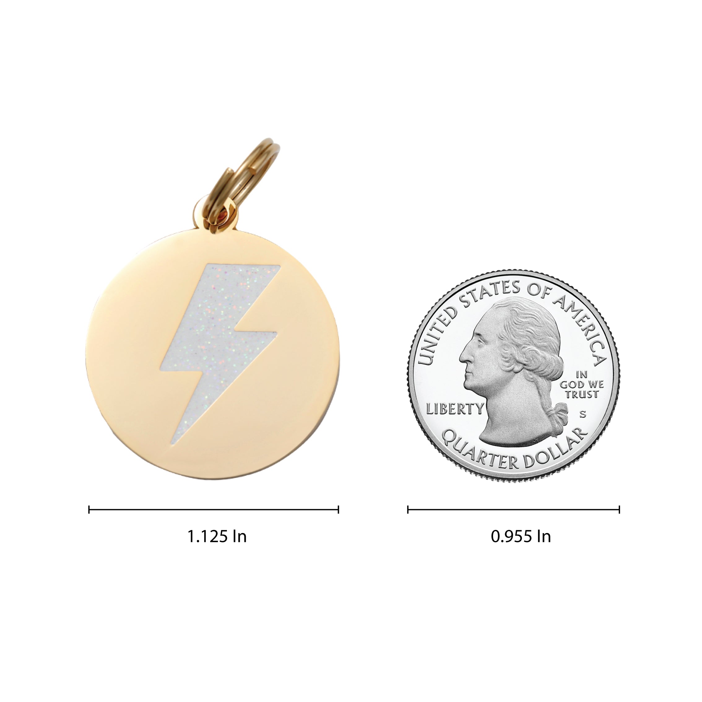 Whether you dog is fast to run after the doorbell or still fast asleep when you walk in, sparks always fly when you see each other. The ‘Lightning Bolt’ Pet ID Tag in gold and white shines with glitter so it’s always a striking to look. Available in black and white with gold or silver plating so your pup’s style is always fresh. Free engraving! Add your dog’s name to one of our custom dog tags for dogs! Each pet ID tag can be personalized with up to four lines of text on the backside. Please include engraving details in the text box and/or order notes section. Our precision laser-engraving is guaranteed to last, so your pup’s way home will never rub off. And its all engraved and shipped in the USA. Make sure to include your engraving details in the ‘Type Pet ID Information Here’ text box. (pet’s name, owner’s name, phone number) Dimensions: 1.125 Inch diameter (28.58mm) Material: Brass, Gold Plating, and Hard Enamel. Please allow 4–5 business days of production time before shipping. Once shipped, U.S. orders usually arrive in 3–5 business days.