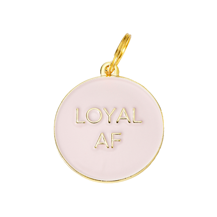 The ‘Loyal AF’ pink dog tag gives recognition to your dog’s best quality, their loyalty. Dogs are always there with you. Everywhere you go. Seriously, the never leave you alone. They follow you to the bathroom. They follow you to the door. You go to fill up your glass with water. There they are. Poor thing. They looked so cozy on the couch. You knew they would come with you to the fridge. You just want to tell the, you’re coming back. Adorable lil’ guy. Even if he knew, he would have come with you anyway, just so you knew, ‘hey girl, I’m with you. I don’t care if I was sleeping on a dog bed made of clouds. You go and I go with you.’ Moves you to tears. Appreciate your dog with the ‘Loyal AF’ Pet ID Tag. Available in black and soft pink so your pup’s style is always fresh. Free engraving! Add your dog’s name to one of our custom dog tags for dogs! Each pet ID tag can be personalized with up to four lines of text on the backside. Please include engraving details in the text box and/or order notes section. Our precision laser-engraving is guaranteed to last, so your pup’s way home will never rub off. And its all engraved and shipped in the USA. Make sure to include your engraving details in the ‘Type Pet ID Information Here’ text box. (pet’s name, owner’s name, phone number) Dimensions: 1.125 Inch diameter (28.58mm) Material: Brass, Gold Plating, and Soft Enamel Please allow 4–5 business days of production time before shipping. Once shipped, U.S. orders usually arrive in 3–5 business days.