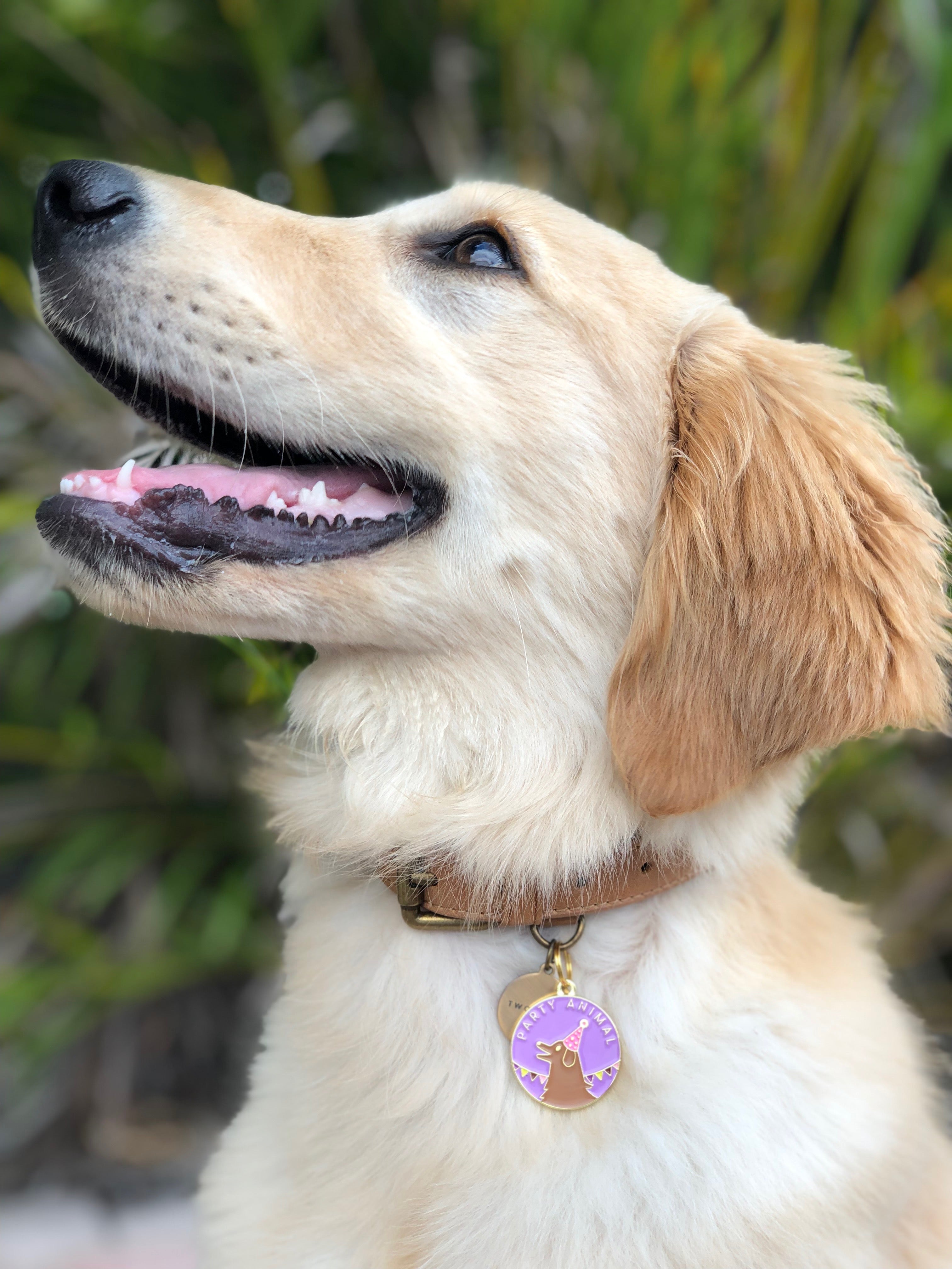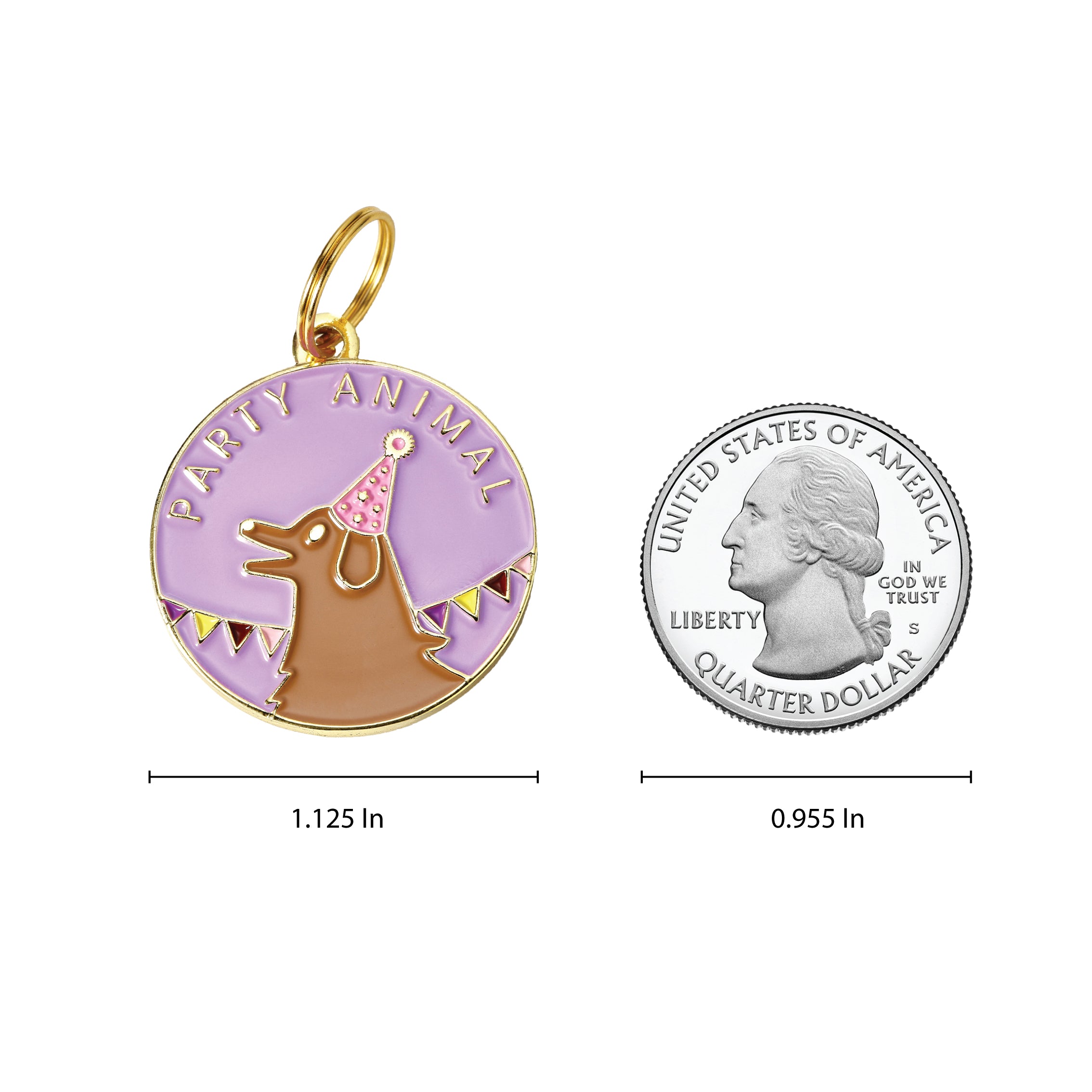 The ‘Party Animal’ Pet ID Tag is for the pup who parties like there’s no tomorrow. Life is too short to let it blow by. Seize the day and party on! Put up some streamers, a few balloons, pop some bubbly and dance it out! Extra party points for anyone wearing a pointy party hat. Celebrate all day and all night with the ‘Party Animal’ Pet ID tag! Free engraving. Add your dog’s name for a pet ID tag! Can be customized with up to four lines of text on the backside. Our laser-engraving is guaranteed to last so your pup’s way home will never rub off. Make sure to include your engraving details in the ‘Type Pet ID Information Here’ text box. (pet’s name, owner’s name, phone number) Dimensions: 1.125 Inch diameter (28.58mm) Material: Brass, Gold Plating, and Soft Enamel