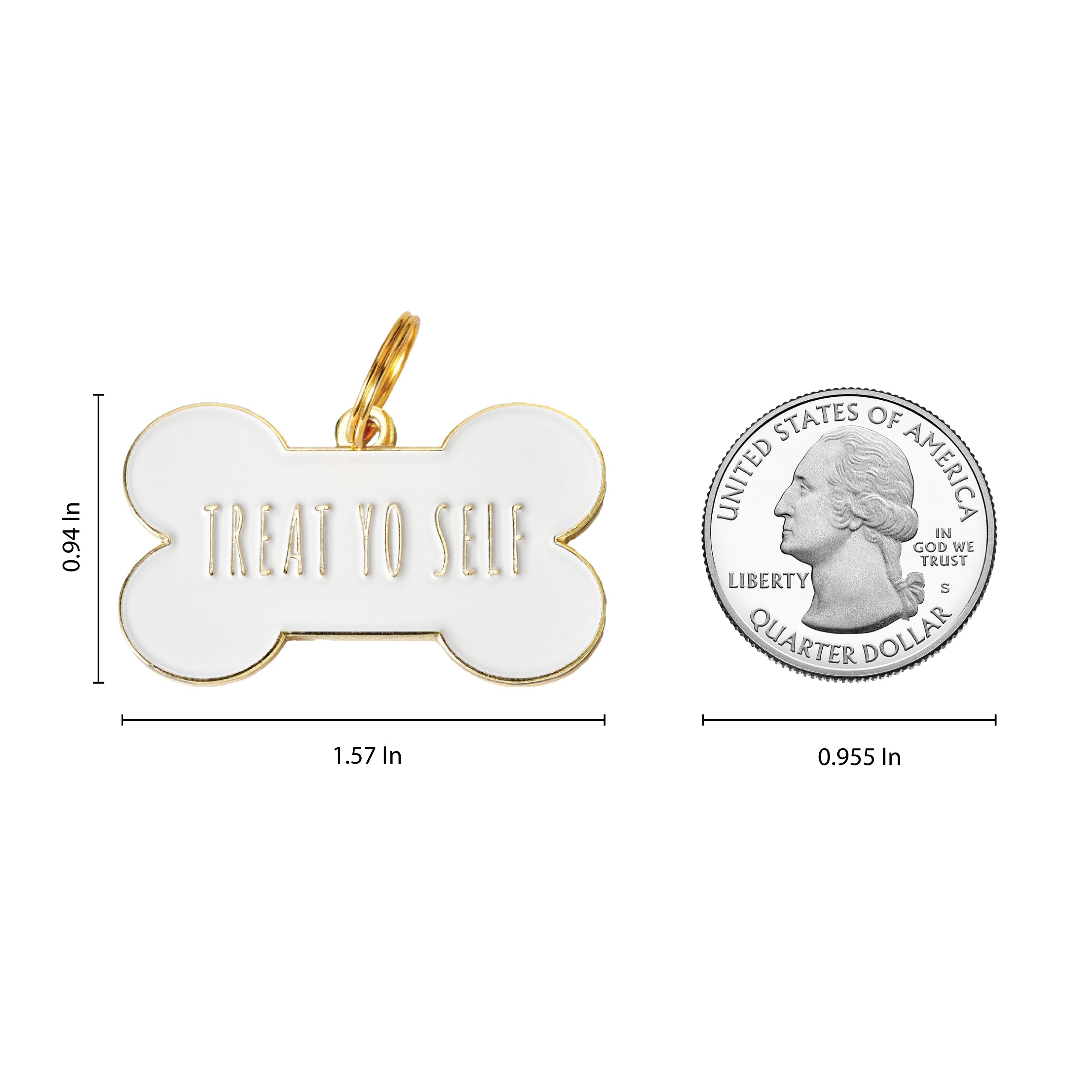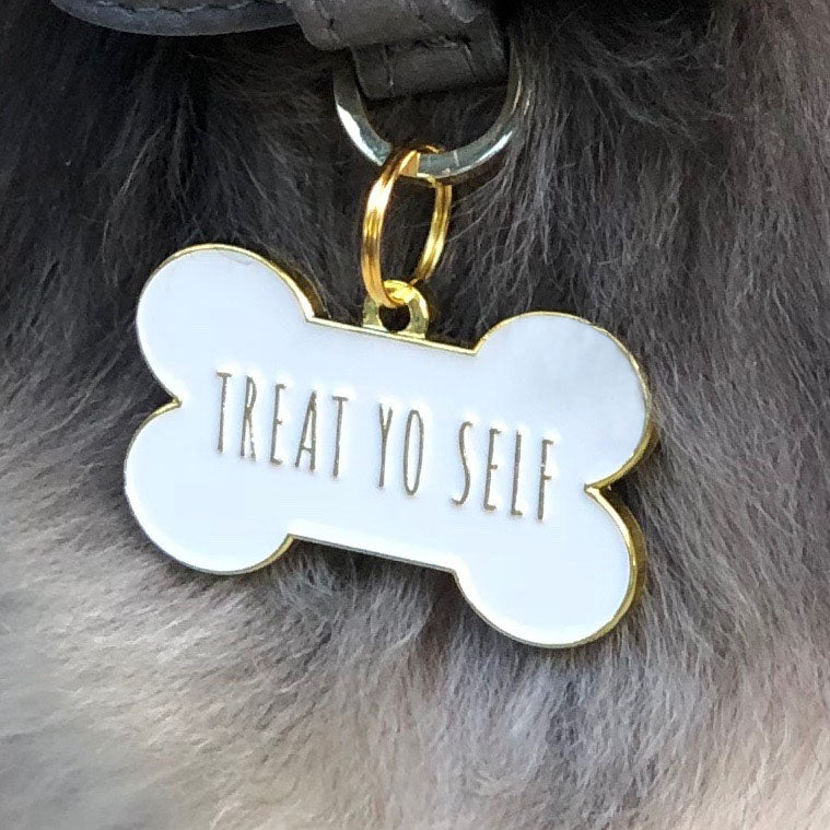 In the name of retail therapy, a piece of chocolate, and a good facial, treat yo’ self to a little style with this ‘Treat Yo Self’ Pet ID Tag in white. Your pup is so good. They wait for you all day. They sit for treats. They cry when Mufasa dies. They’re such good boys and girls. Treat them! And give yourself a treat too for being such a good dog mama. Treats for everyone with the ‘Treat Yo Self’ Pet Id Tag in white. Available is black and white so your pup’s style is always fresh. Free engraving! Add your dog’s name to one of our custom dog tags for dogs! Each pet ID tag can be personalized with up to four lines of text on the backside. Please include engraving details in the text box and/or order notes section. Our precision laser-engraving is guaranteed to last, so your pup’s way home will never rub off. And its all engraved and shipped in the USA. Make sure to include your engraving details in the ‘Type Pet ID Information Here’ text box. (pet’s name, owner’s name, phone number) Dimensions: 1.57 Inch x 0.94 Inch Material: Brass, Gold Plating, and Soft Enamel Please allow 4–5 business days of production time before shipping. Once shipped, U.S. orders usually arrive in 3–5 business days.