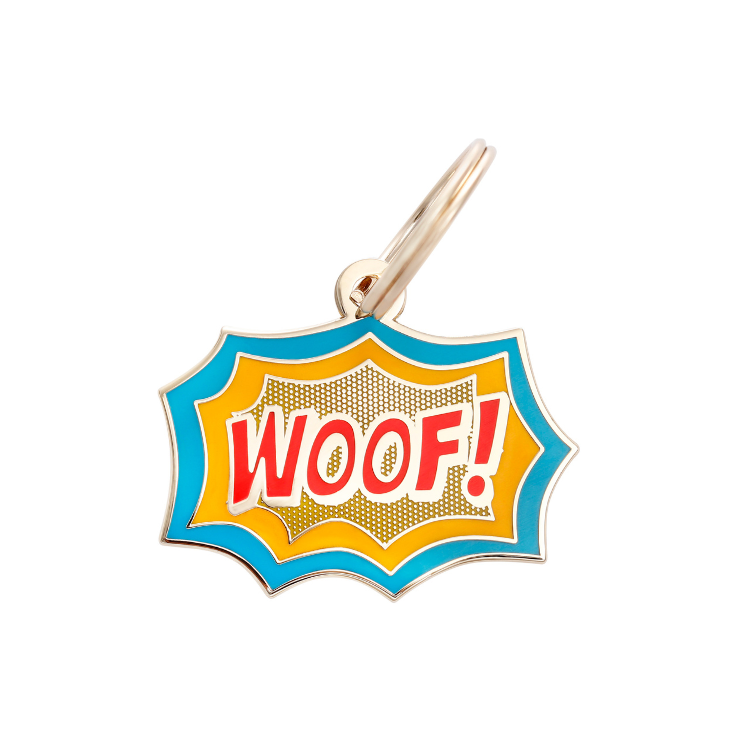 Faster than a speeding bullet. More powerful than locomotive. Able to leap tall onto the bed in a single bound. Woof, Its Super-dog! And look! He’s wearing his Woof! Pet ID Tag, exclaiming for all to see our hero has arrived to save the day! Woof, Super-dog. Woof, indeed! Free engraving! Add your dog’s name to one of our custom dog tags for dogs! Each pet ID tag can be personalized with up to four lines of text on the backside. Please include engraving details in the text box and/or order notes section. Our precision laser-engraving is guaranteed to last, so your pup’s way home will never rub off. And its all engraved and shipped in the USA. Make sure to include your engraving details in the ‘Type Pet ID Information Here’ text box. (pet’s name, owner’s name, phone number) Dimensions: 1.25 Inch x 1.06 Inch (31.75 mm x 27.03 mm) Material: Brass, Gold Plating, and Hard Enamel. Please allow 4–5 business days of production time before shipping. Once shipped, U.S. orders usually arrive in 3–5 business days.